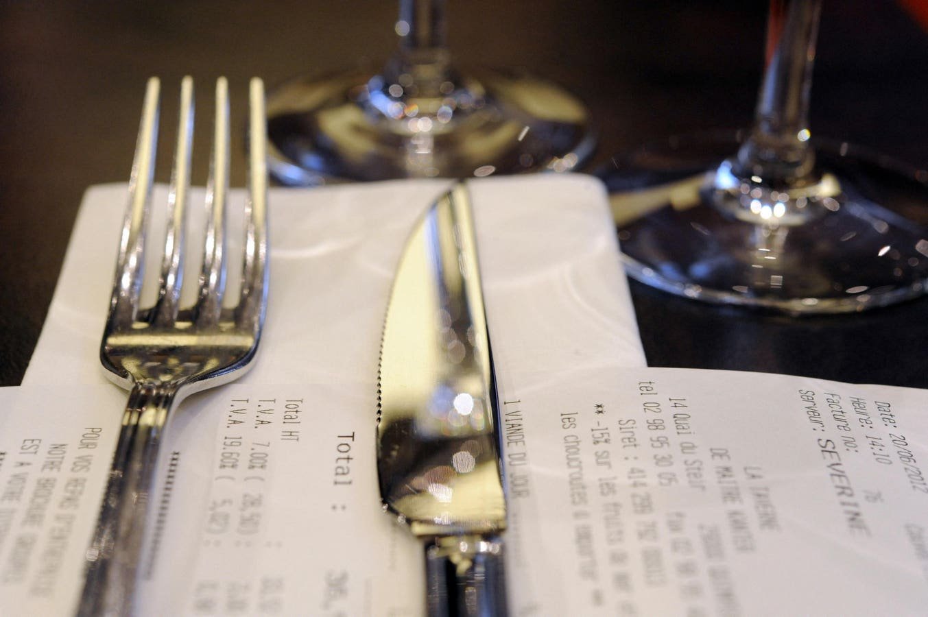 A photo taken on June 20, 2012 at a restaurant in Quimper, western France, shows the fork and knife in…